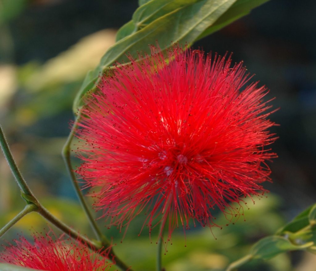 Allen voran steht der feuerrote Puderquastenstrauch Calliandra tweedii. Seine zierlichen Triebe tragen im Sommer viele Wochen lang den attraktiven, exotischen, roten Flor, der 8-10 cm Durchmesser erreichen kann. Die leuchtend roten Pinselblüten stehen dabei in einem spannenden Kontrast zu den feinen, leicht behaarten, akaziengleichen und silbrig – grünen Fiederblättern. Es ist schon verwunderlich, diesen Blätter zuzusehen, wie sie sich am Abend oder bei Wassermangel nach oben zusammenrollen und ihre silbrig schimmernde Blattunterseite präsentieren.