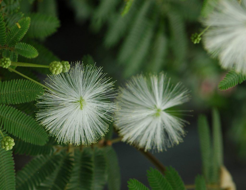 Wer es eleganter mag, wird sich vom weiß blühenden Puderquastenstrauch angezogen fühlen: Calliandra portoricensis. Seine feinen Fiederblätter sind hellgrün und die beinahe schon kugelrunden Blüten gleichen riesigen Schneeflocken. Der filigrane Wuchs und die reinweißen Blüten machen den Weißeen Puderquastenstrauch zu einem stilvollen Wintergartenbewohner.