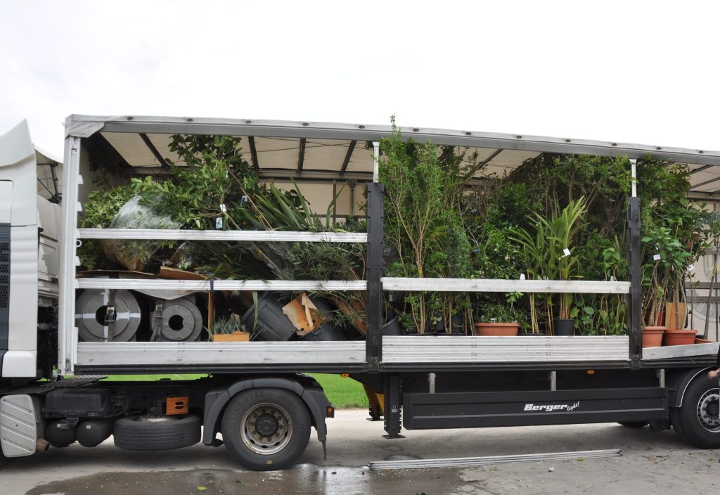 Aber jedes Jahr im Frühsommer bestellen wir Pflanzen nach, um unseren Kunden auch weiterhin ein breites Angebot bieten zu können oder um ganz spezielle Kundenwünsche erfüllen zu können. Pflanzen die bereits ausverkauft waren oder besondere Kundenwünsche, meist von Großpflanzen, bestellen wir bei unseren Partnern in Italien oder Spanien nach. Wenn wir von ihnen grünes Licht erhalten, schicken wir einen LKW los. Dieser wird dann von unseren Partnern an fünf oder sechs Stationen mit mehreren tausenden Pflanzen beladen und fährt anschießend zu uns zurück.