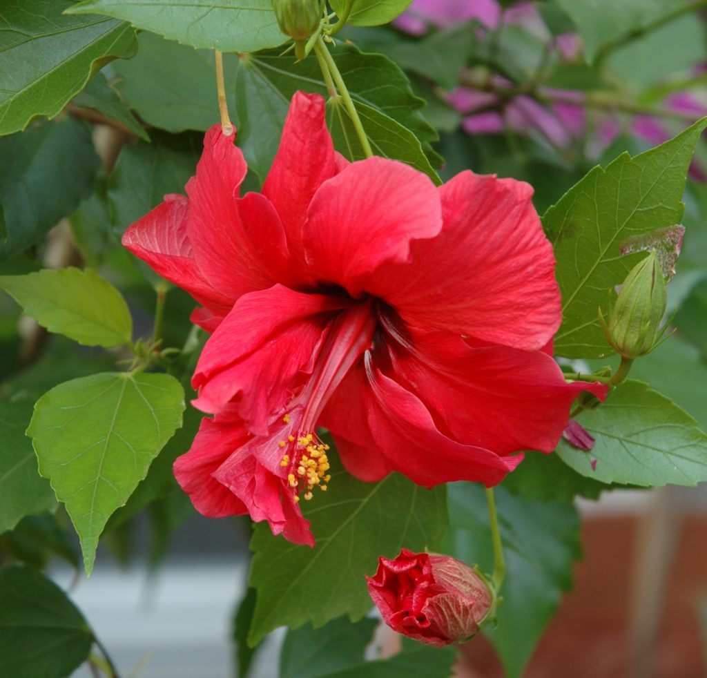 Erst nach der letzten der drei Eisheiligen, der Kalten Sophie am 15. Mai, habe ich es gewagt, mein Hibiskusstämmchen auf die Terrasse zu stellen. Die einzelnen Blüten meines Hibiskusstämmchens sind nicht besonders langlebig, sie öffnen sich am Morgen und welken meist bereits am Nachmittag, aber in dem sattgrünen Laub erscheinen immer neue Knospen, die sich schon nach wenigen Tagen öffnen, sodass mein Bäumchen immer blüht. Es vergeht praktisch kein Tag ohne eine geöffnete Blüte.
