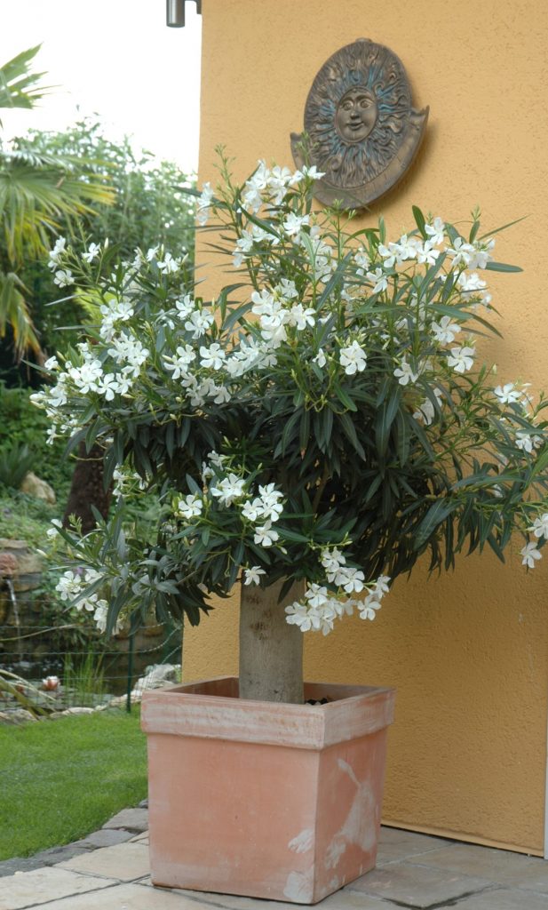 Einer oder mehrere,  weiße Oleander (Nerium oleander) sind die Grundlage weißer Terrassengestaltungen, denn sie zählen zu den Dauerblühern, die den ganzen Sommer die edlen Blüten liefern, alternativ auch in gefüllter Form.