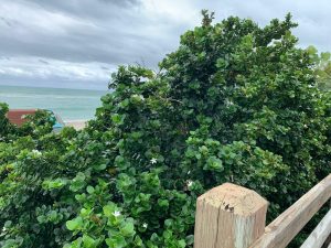 Der Garten wird durch einen hübschen Stakentenzaun begrenzt und dahinter wächst eine Meertraubenhecke (Coccoloba uvifera). Leider sind die Früchte, die an Weintrauben erinnern, noch nicht reif. Man kann nämlich das süße Fruchtfleisch der Meer- oder Seetraube nicht nur zu Gelee oder Wein verarbeiten, sondern auch frisch vom Baum essen.