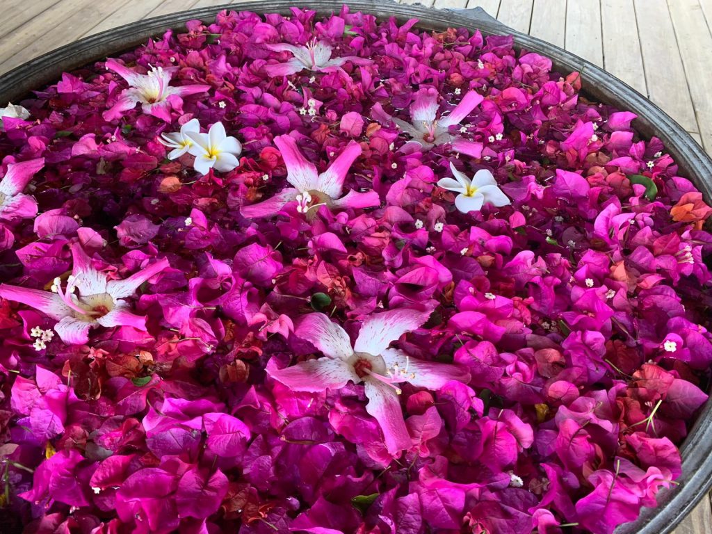 Die Flora ist hier im Südosten der USA so üppig und die Blütenpracht so überschwänglich, dass stilvolle Dekorationen mit Blüten eine Selbstverständlichkeit sind. Vor allem die hübsche Schale mit Plumerienblüten, Bougainvilleenblüten und den Blüten des Florettseidensbaums, die mich am Empfangstresen des B & Bs bei jeder Rückkehr begrüßte, werde ich vermissen.