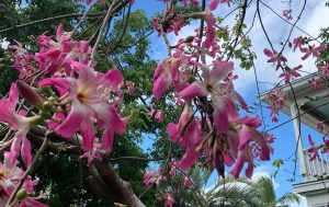Hunderte wunderschöne weiß-rosa farbene Blüten der Chorisia speciosa (Florettseidenbaum) schmücken jetzt im Herbst den Baum während er das Laub abwirft und die typischen kräftigen Stacheln an Stamm und an den Ästen zum Vorschein kommen. In diesem Garten ist der Baum keine Trockenzeiten ausgesetzt und benötigt keinen Wasserspeicher, sodass der ansonsten charakteristisch verdickte Flaschenstamm nur sehr schwach ausgeprägt ist. Dennoch ist hier in Florida, wo ohnehin fast ebenso viel spanisch wie englisch gesprochen wird, der Florettseidenbaum auch unter dem Namen árbol botella bekannt.