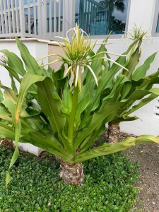 Am Aufgang zur Eingangstür wartet eine Asiatische Hakenlilie (Crinum asiaticum) mit ihren filigranen und prächtigen Blüten den Besuchern auf.
