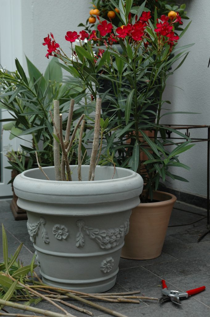 Oleander (Nerium) zählen mit ihren leuchtstarken Blüten zu den beliebtesten Kübelpflanzen. Mit ihrem kräftigen Wachstum, das reichlich Wasser und Dünger fordert, erfüllen sie Ihre Besitzer anfangs mit Stolz. Doch schon nach wenigen Jahren droht Oleander vielen ambitionierten Topfgärtnern über den Kopf zu wachsen. Falsch wäre es in dieser Situation, die Triebe vom Vorjahr alle einzukürzen! Oleander bildet die neuen Blüten schon im Spätsommer am Ende der Triebspitzen – ober der Stellen, die den vorangegangenen Flor getragen haben. Würde man die Triebspitzen alle im Spätwinter kappen, brächte man sich um die gesamte Blüte. Oleander lichtet man deshalb jährlich nach der Methode des Verjüngungsschnitts aus. Das heißt: Man nimmt jedes Jahr einen oder mehrere der jeweils ältesten Triebe ganz heraus. Die jüngeren bleiben stehen und werden für die neuen Blüte sorgen. Ist ein Oleander völlig aus der Form geraten, kann man ihn auch problemlos -auf den Stock setzen-, also alle Triebe auf 15 bis 20 cm Länge einkürzen. In südlichen Ländern, in denen sich die Vegetationszeit im Herbst bis November ausdehnt und schon im Februar neu beginnt, führt man solche Radikalschnitte im August durch, hierzulande im März. Auf die Blüte müssen sie im gleichen Jahr verzichten, doch ab dem Folgejahr beginnt der Blütenreigen an vollsonnigen Standorten von Neuem.