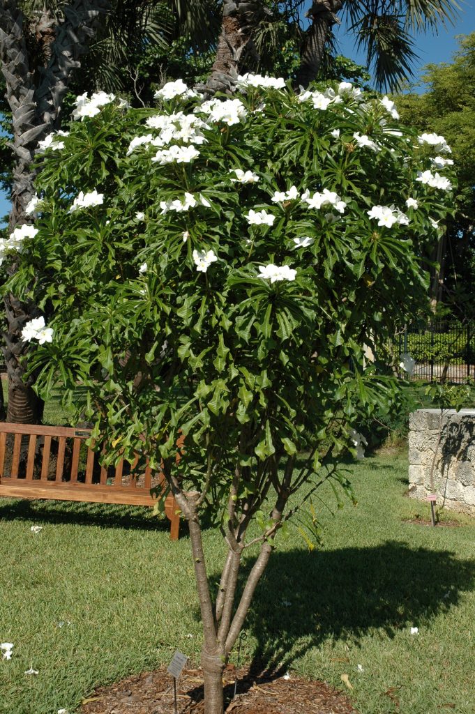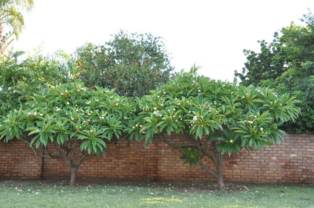 Vor und nach der Blüte machen die glänzenden dunkelgrünen Blätter, die bei der Plumeria rubra spitz zulaufen, bei der Plumeria obtusa rundlich enden und bei der Plumeria pudica löffelförmig gewellt sind, die Attraktivität der Pflanzen aus. In der Regel verzweigten sich die Pflanzen im kommenden Jahr an der abgeblühten Triebspitze, sodass mit den Jahren auch unter europäischen Glashausbedingungen ein eindrucksvoller Strauch entsteht.